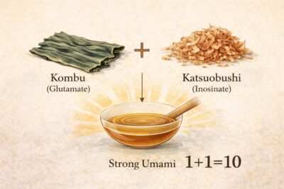 The key idea behind dashi is umami, the savory taste that gives food depth and satisfaction. Kombu is especially rich in glutamate, while katsuobushi and niboshi contain inosinate. When ingredients like these are combined, their savory compounds can reinforce one another through umami synergy, creating a broth that feels fuller and deeper than its appearance suggests.