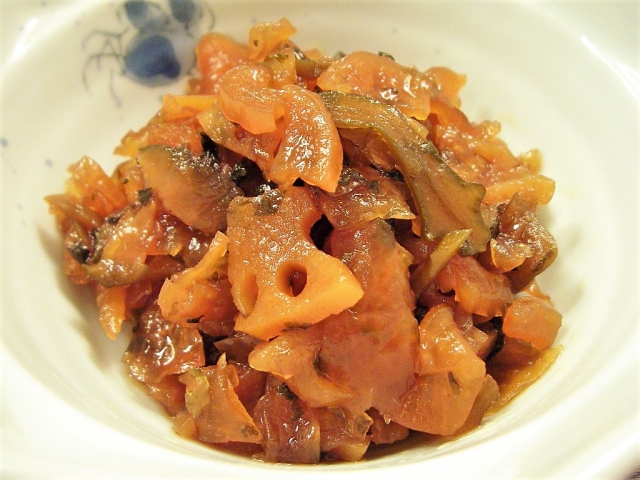 Japanese curry is often served with fukujinzuke, a type of relish made from finely chopped vegetables such as daikon radish, lotus root, and cucumber pickled in soy sauce and mirin.