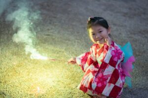 At home, families often enjoy handheld fireworks (tezutsu hanabi or senko hanabi) — tiny sparklers that glow quietly in the night.