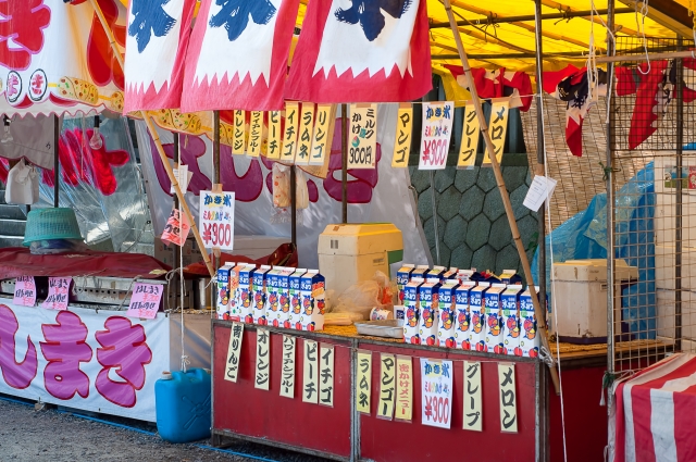 The sound of laughter mixes with the rhythmic calls of food vendors, and the air is filled with the sweet scent of yakisoba and kakigori (shaved ice).