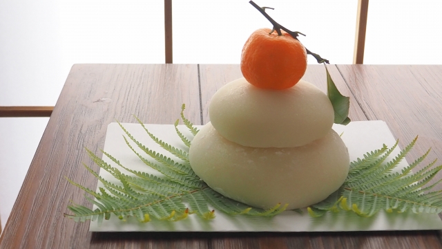 Kagami mochi is a traditional New Year offering consisting of two stacked rice cakes with a citrus fruit on top.