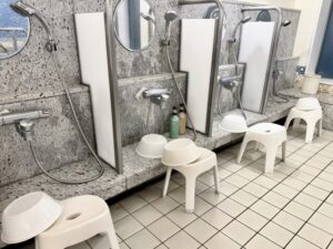 You will see showers or small faucets along the wall. Sit on the stool and rinse your entire body before soaking.
