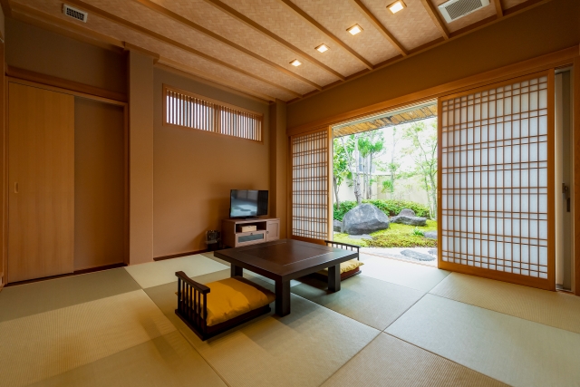 tatami floors, sliding shoji doors, and a low table with a tea set.